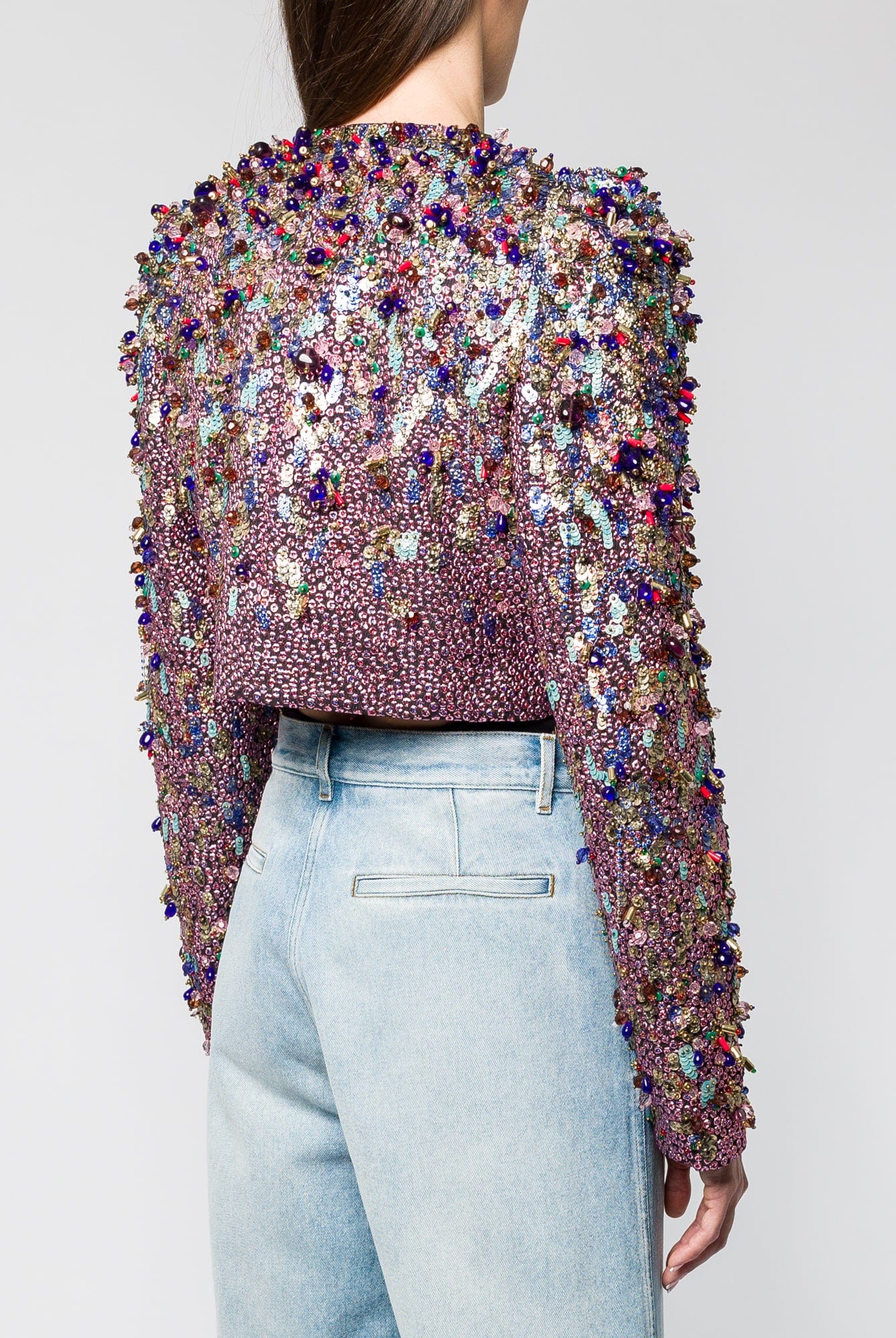 Dries Van Noten designs the "Bea" short jacket for Fall/Winter 2024, entirely transformed by a constellation of sequins and scattered rhinestones. The piece defies traditional eveningwear with its open front, round collar, and long sleeves, creating a garment that exists between sculpture and sartorial expression.