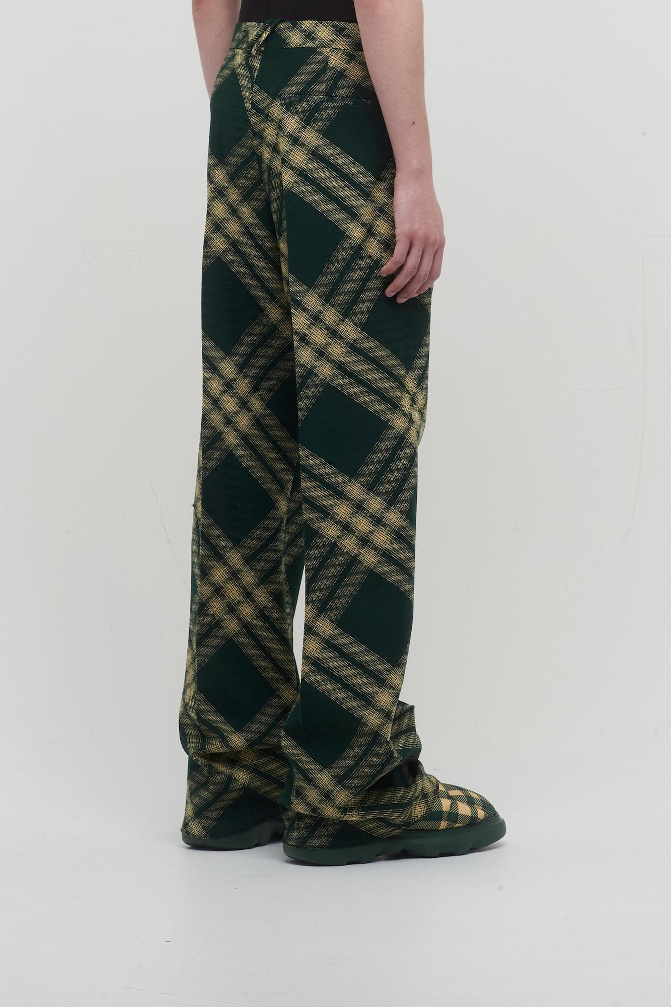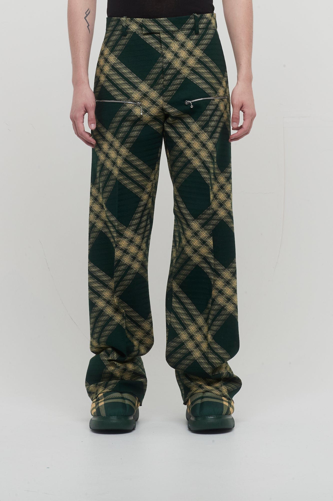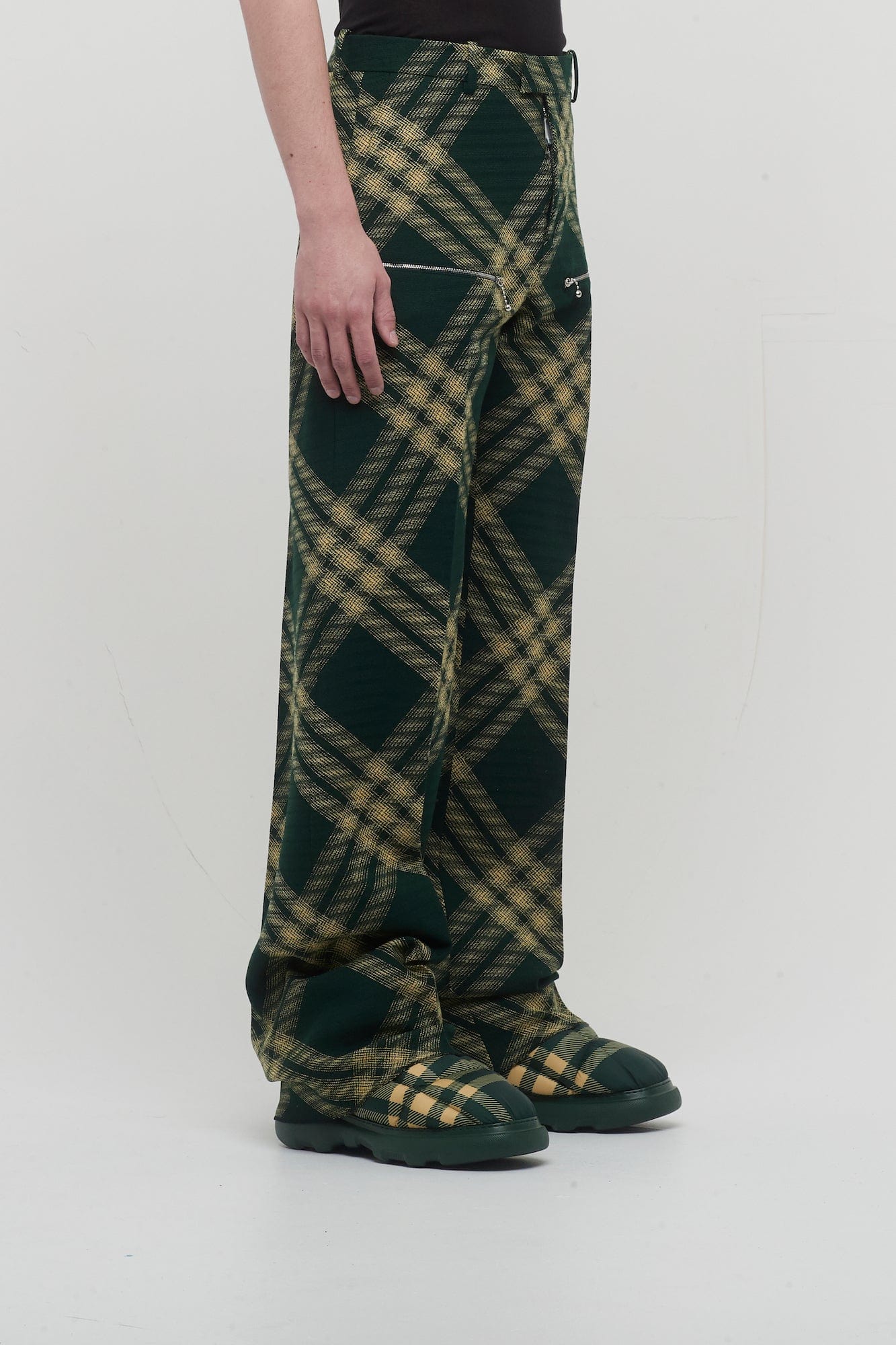These trousers from Burberry's Spring collection are a green and yellow tonal update on the brand's signature check pattern. The wool twill fabric is interrupted by a distinct silvertone zipper with signature bell shaped pulls. The trousers have a modern, slightly oversized fit with hook and eye closure and zip fly.