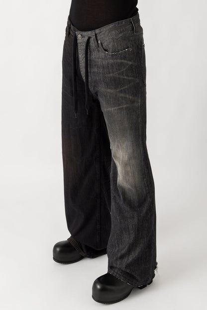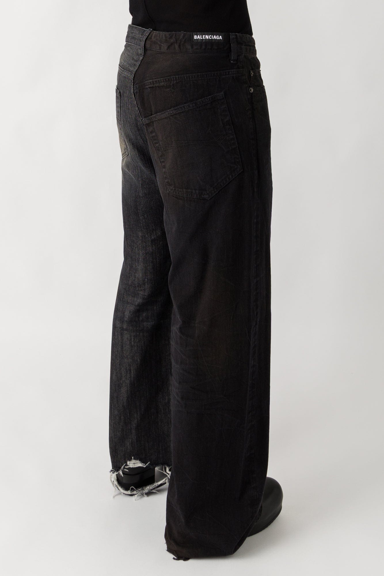 The Balenciaga Fifty-Fifty Pants in Light Black feature an asymmetric hem and adjustable waist strap with front zip fastening. Constructed with classic five-pocket styling and belt loops in full length, these pants combine a sleek silhouette with functional details for versatile everyday wear.