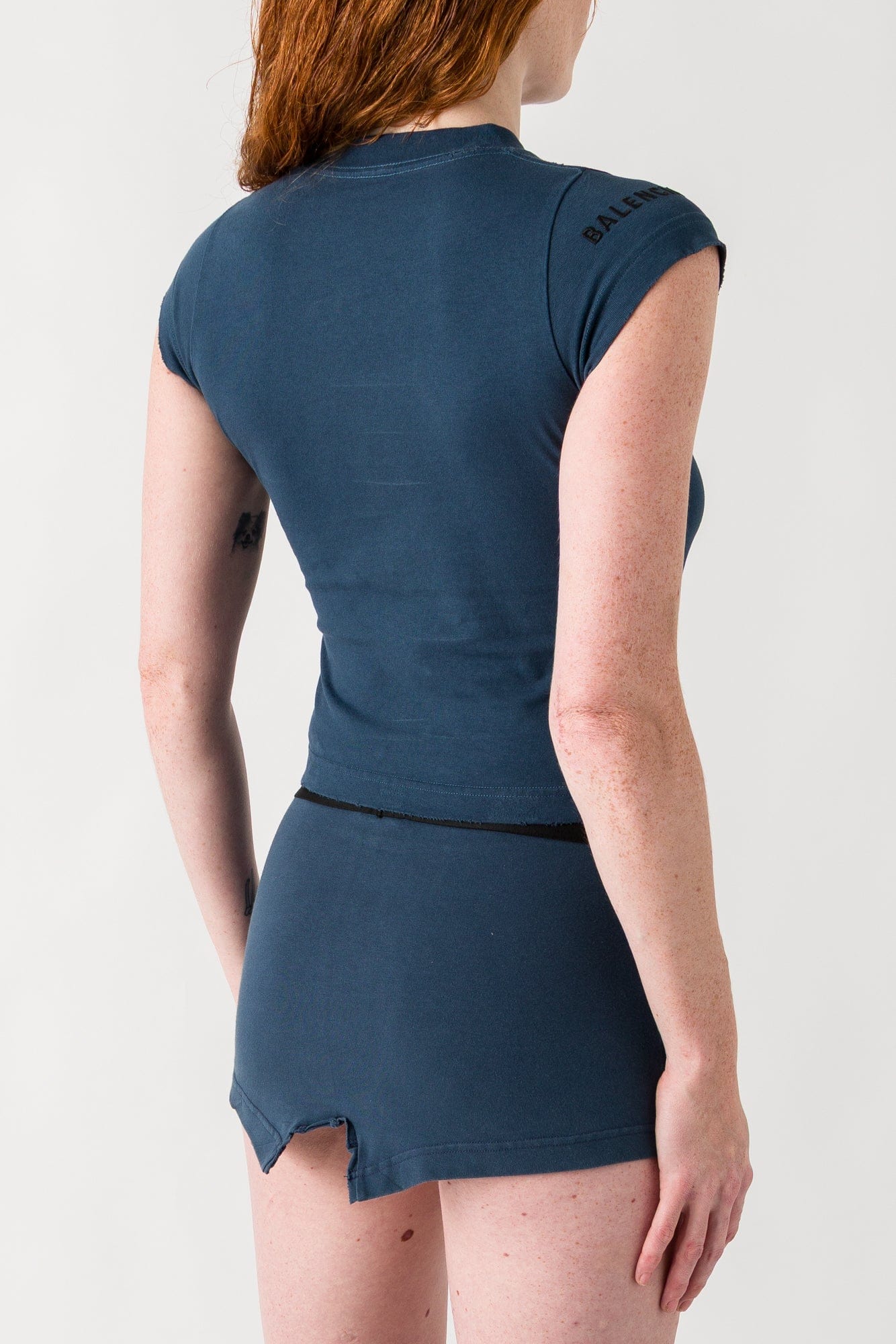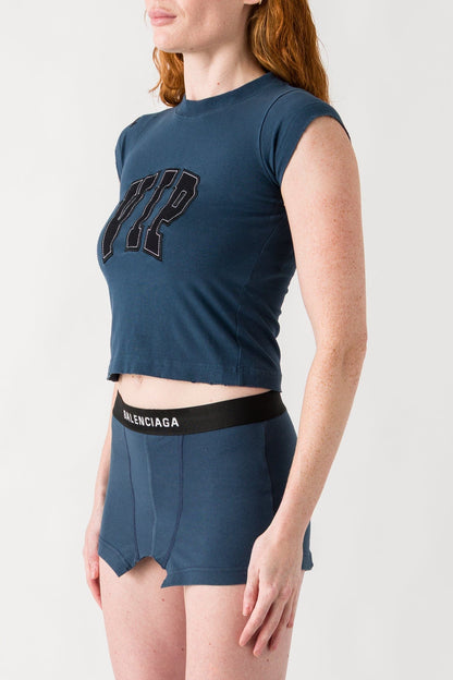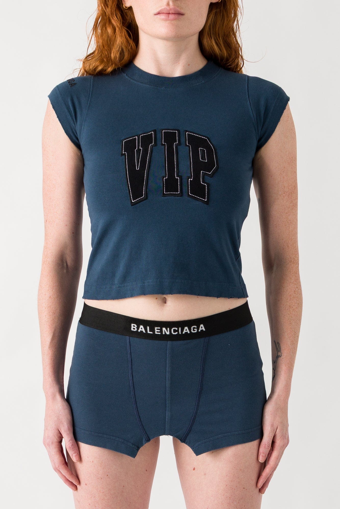 The Balenciaga Shrunken VIP T-Shirt features a peeling stretch jersey construction with crewneck and ultra short sleeves in a cropped, shrunk fit design. A bold VIP patch appliqué at the front adds distinctive detail to this Fall/Winter 2025 collection piece. Constructed from 95% cotton and 5% elastane for comfortable stretch.