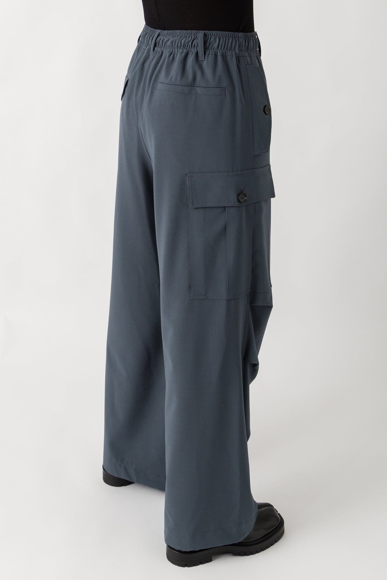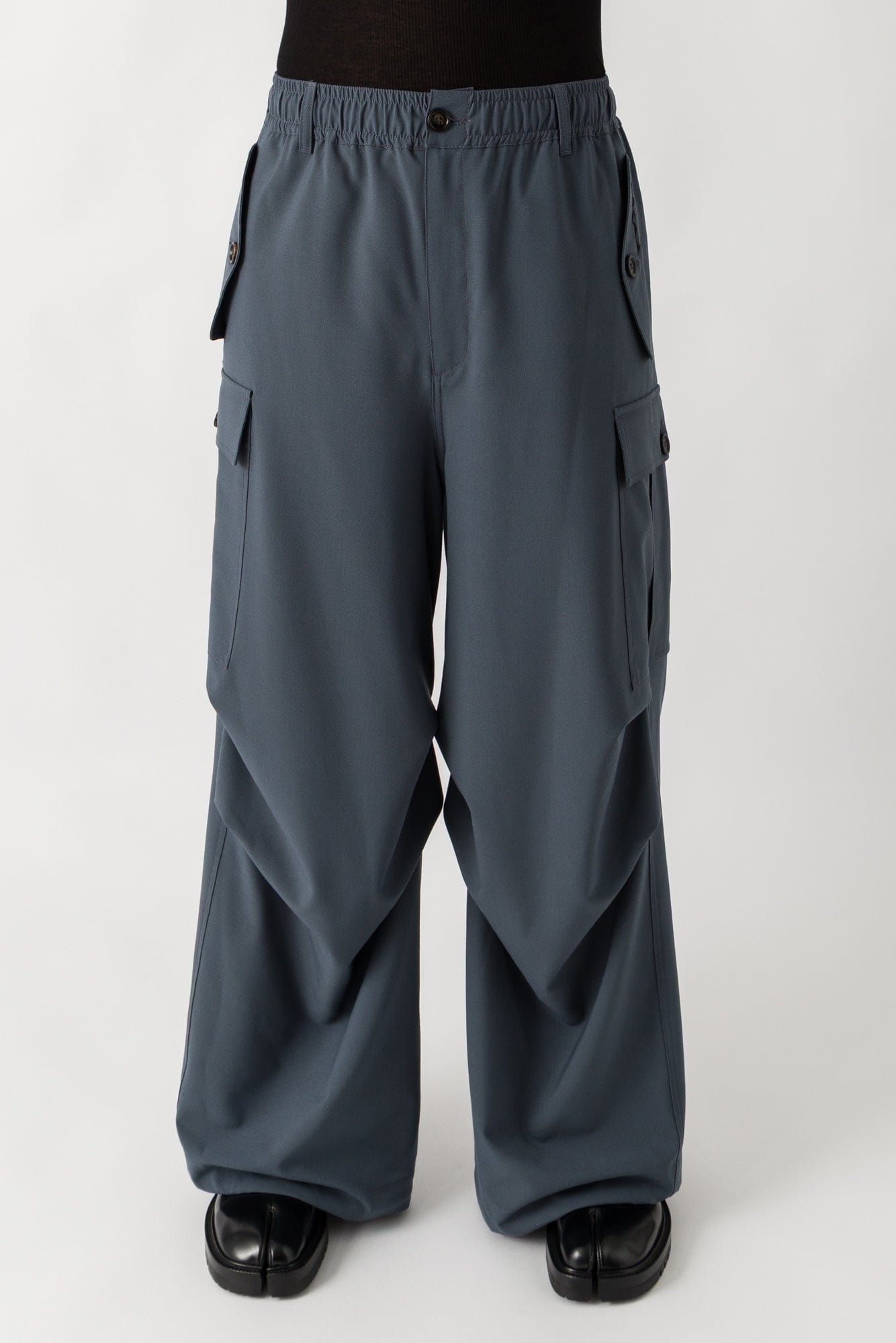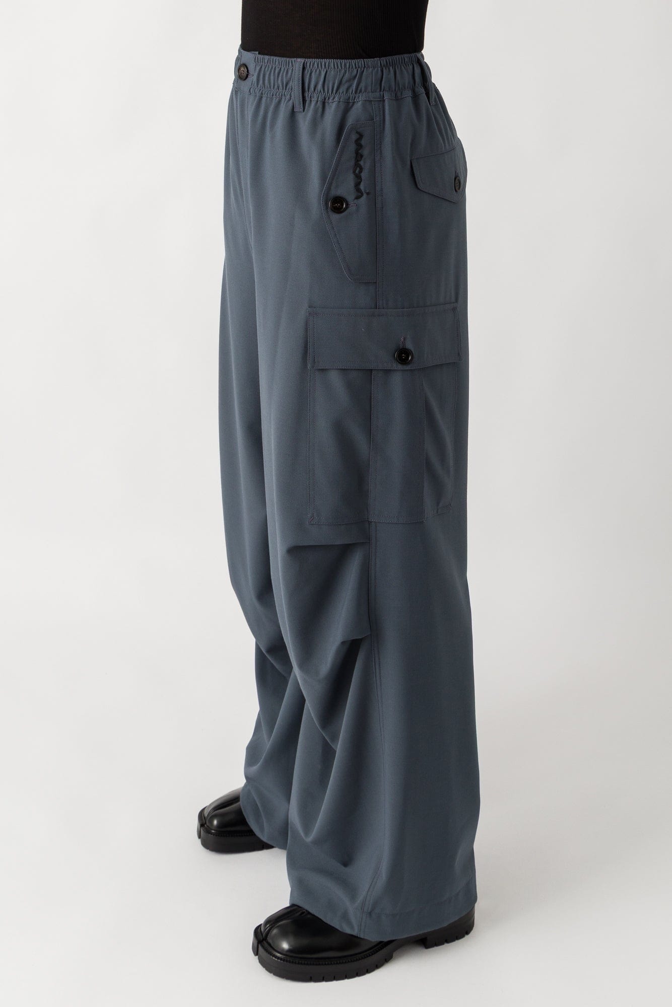 The Marni Uniform Cargo Pants are crafted from light technical wool blend with elasticated construction. These loose, low-rise cargo pants feature gathered knees, drawstrings at waist and cuffs, and buttoned side pockets with patch pocket details. Marni's hand-embroidered symbol on the left side completes the Italian-made design.