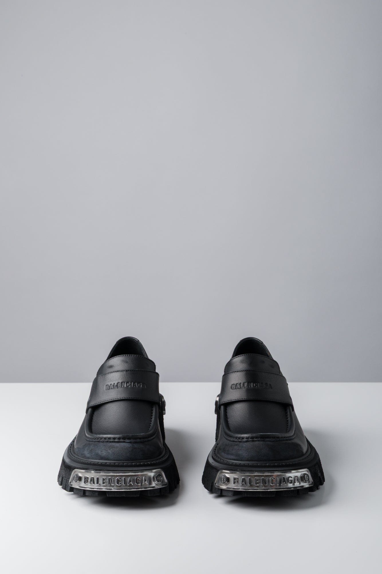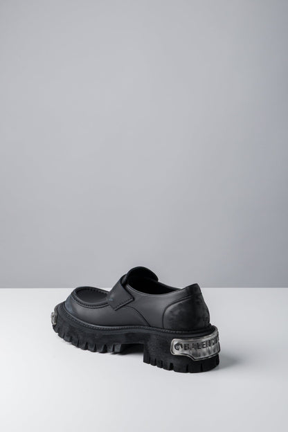 These black loafers from Balenciaga's Spring/Summer 2025 collection feature a chunky treaded sole, front and back plate with logo, and a logo debossed on the upper.