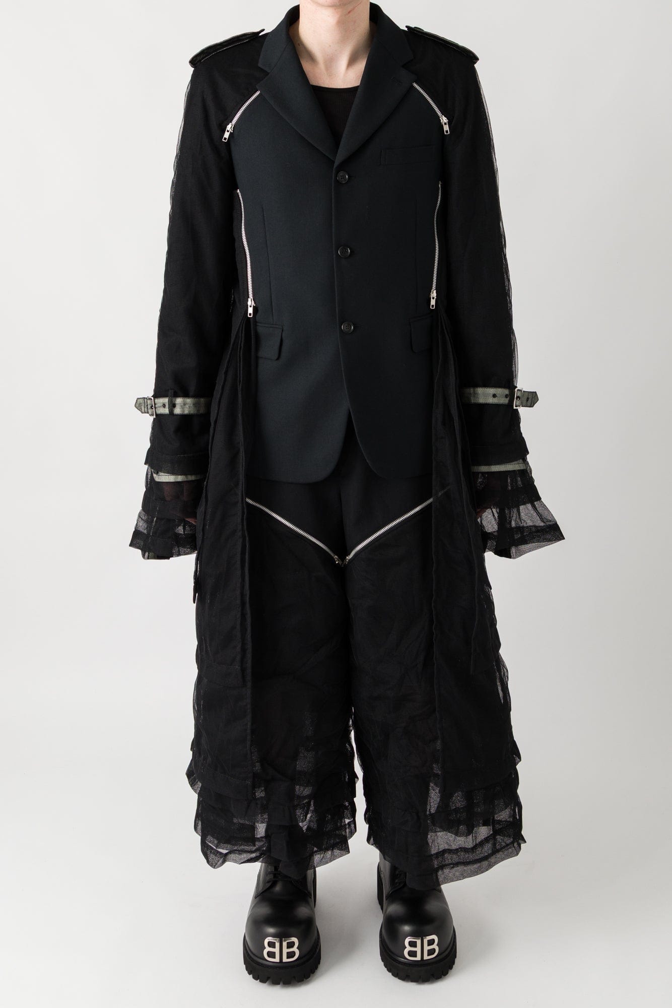 The Comme des Garçons Homme Plus Spring/Summer 2025 collection presents the Bondage Layered Blazer in black. The design takes an avant-garde approach to the traditional blazer silhouette with attached nylon tulle layers secured by side zip fastenings. Details include distinctive belted cuffs, button closure, and two front pockets. The jacket exemplifies the brand's experimental approach through architectural layering and unexpected material combinations.