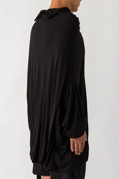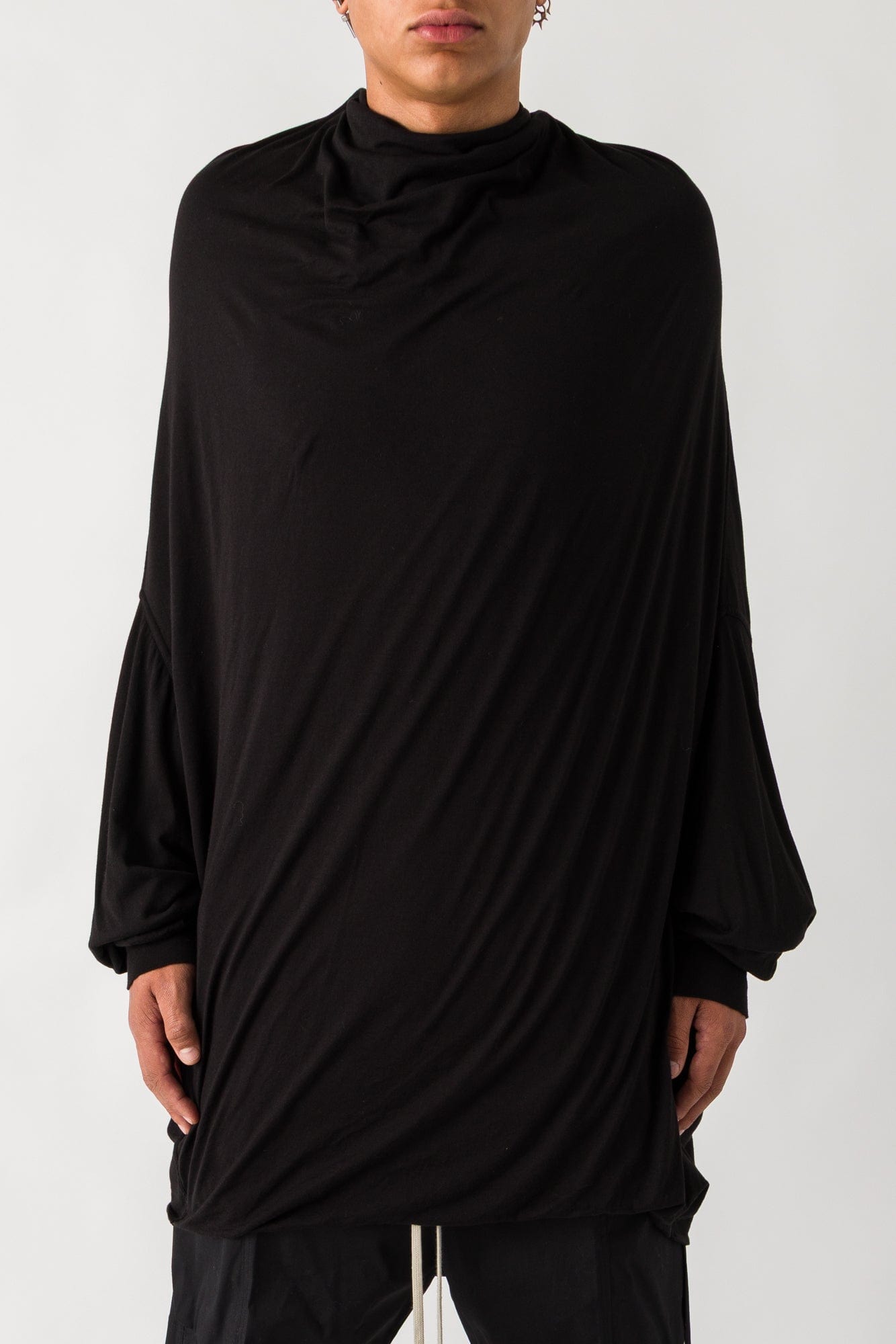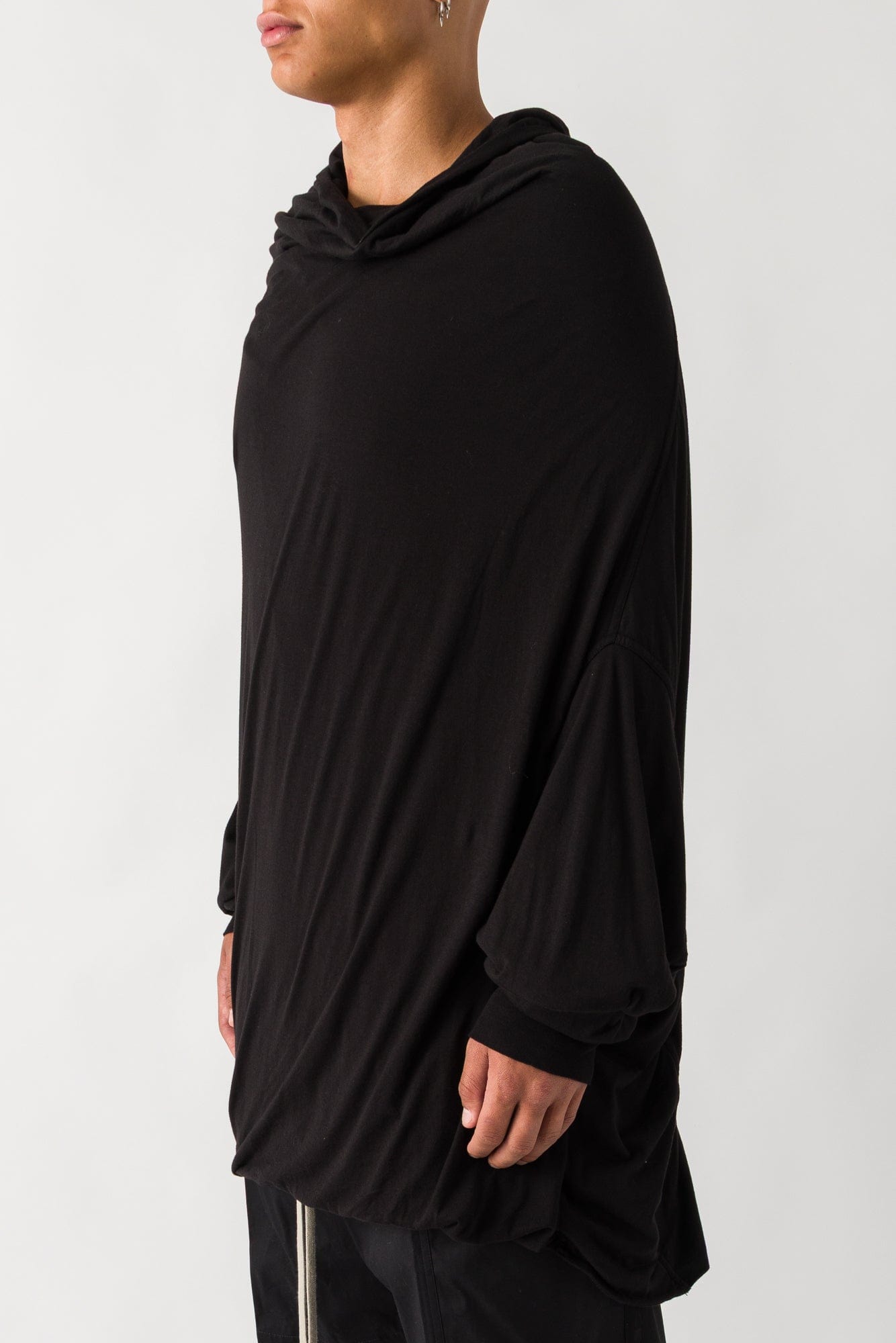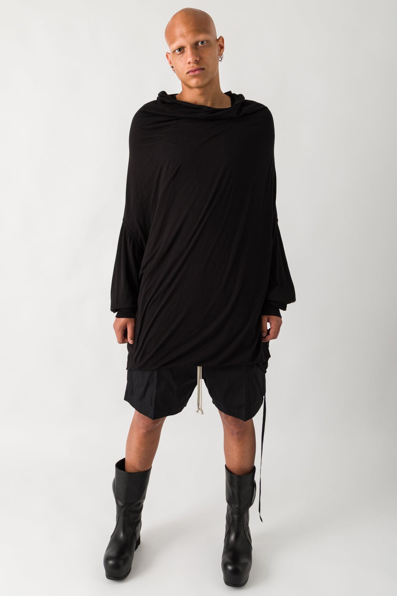 This Rick Owens DRKSHDW Shroud from Spring/Summer 2025 is a hip-length sweatshirt with a draped tubular neckline that widens over the shoulders and falls to low armholes. Made from garment-dyed heavyweight cotton jersey using GOTS certified organic cotton, it features ribbed cuffs, a center back neck split, and the signature seam line running down the spine.