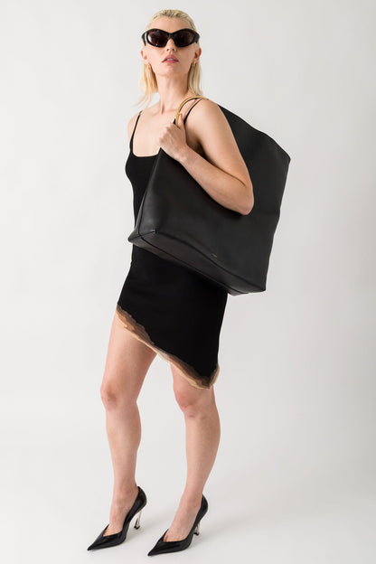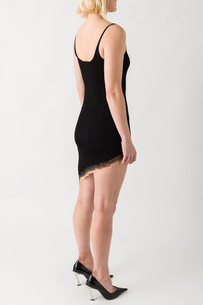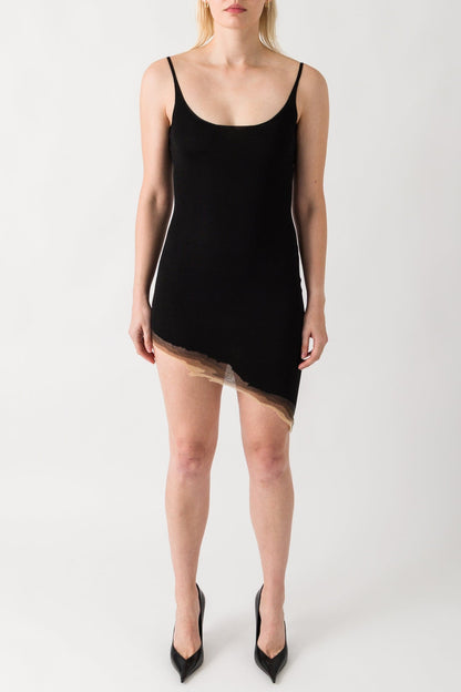 Grace Ling presents the Flame Slit Mini Dress in Black for their Spring/Summer 2025 collection. This knit mini dress features an asymmetrical hem design with unique 3D flame-edge detail and sheer ombre trim that creates a sleek silhouette.