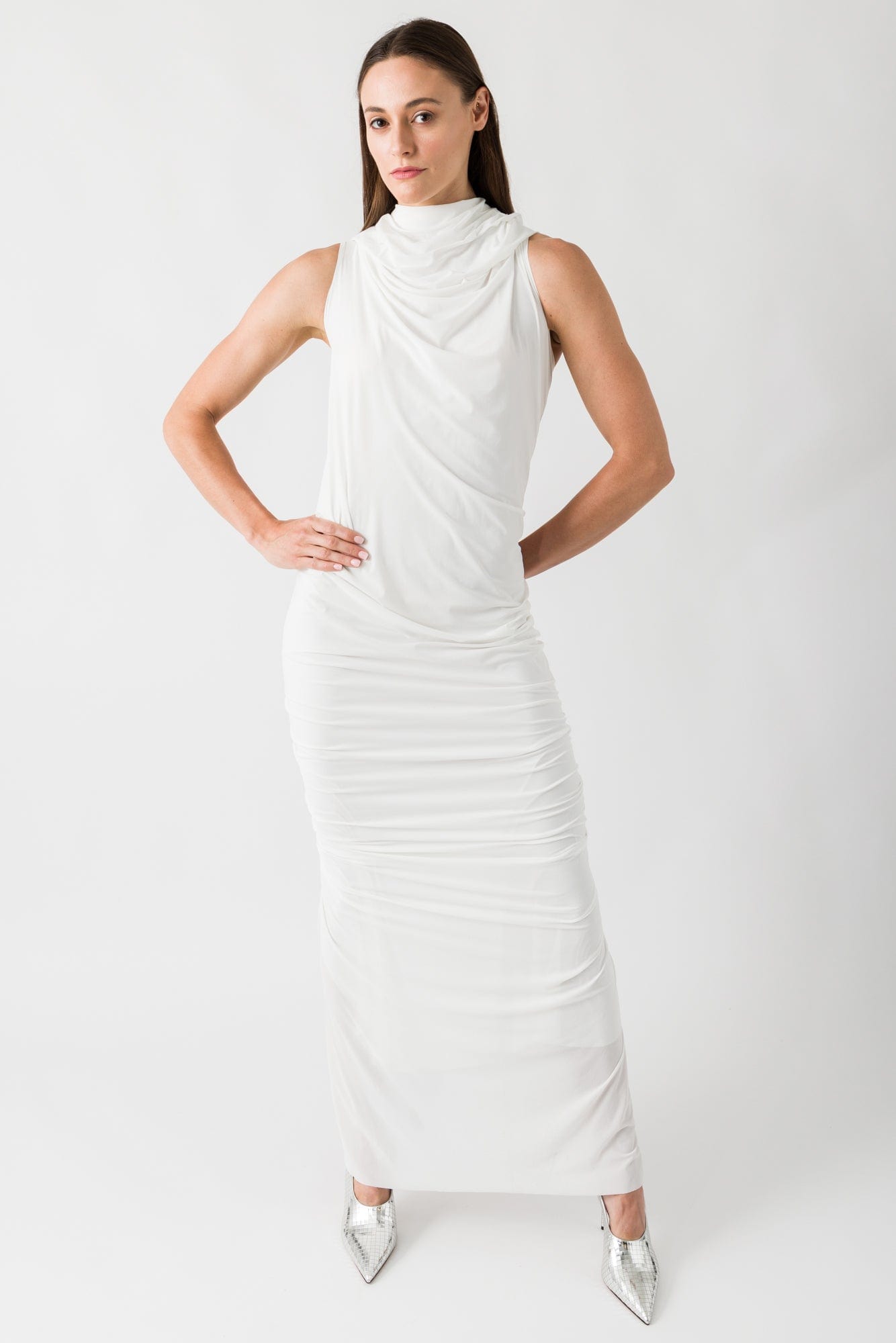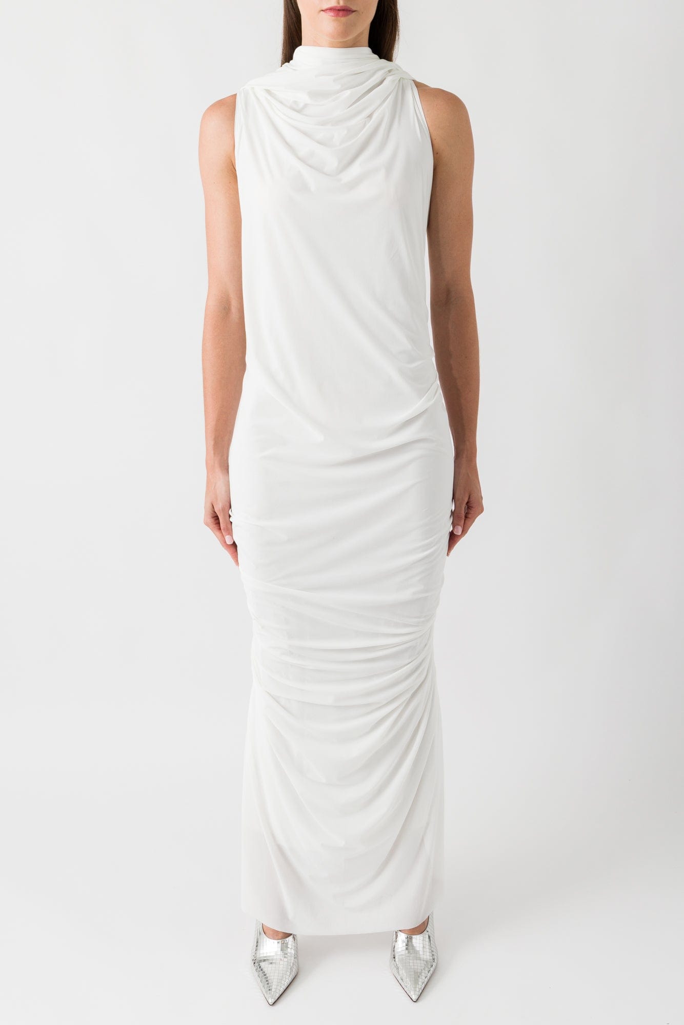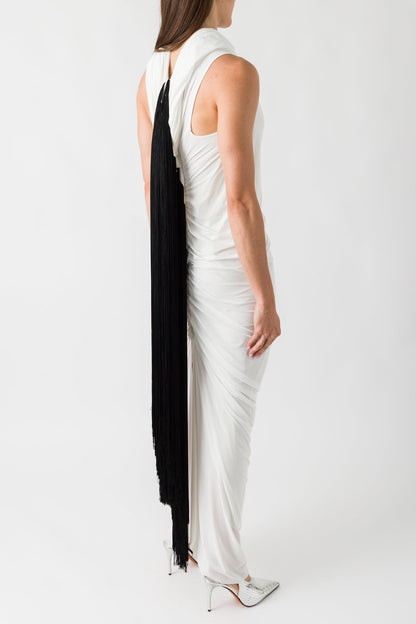 Jean Paul Gaultier presents the Stretch Jersey Double Layer Long Dress with Fringes for their Spring/Summer 2025 collection. This stretch nylon jersey maxi dress features a tight fit with gathering throughout, ruched seams, and black and white fringes, complete with a 3D logo detail at the mock neck and invisible back zip closure.