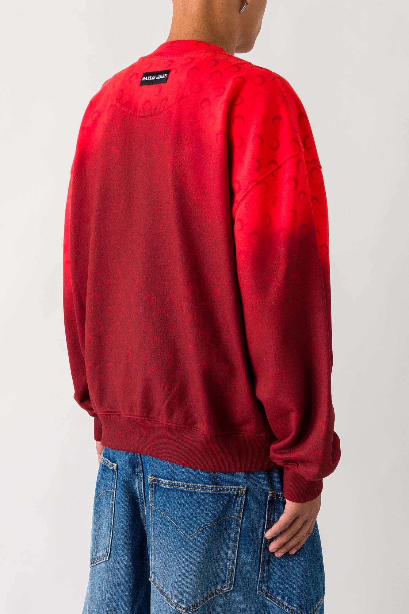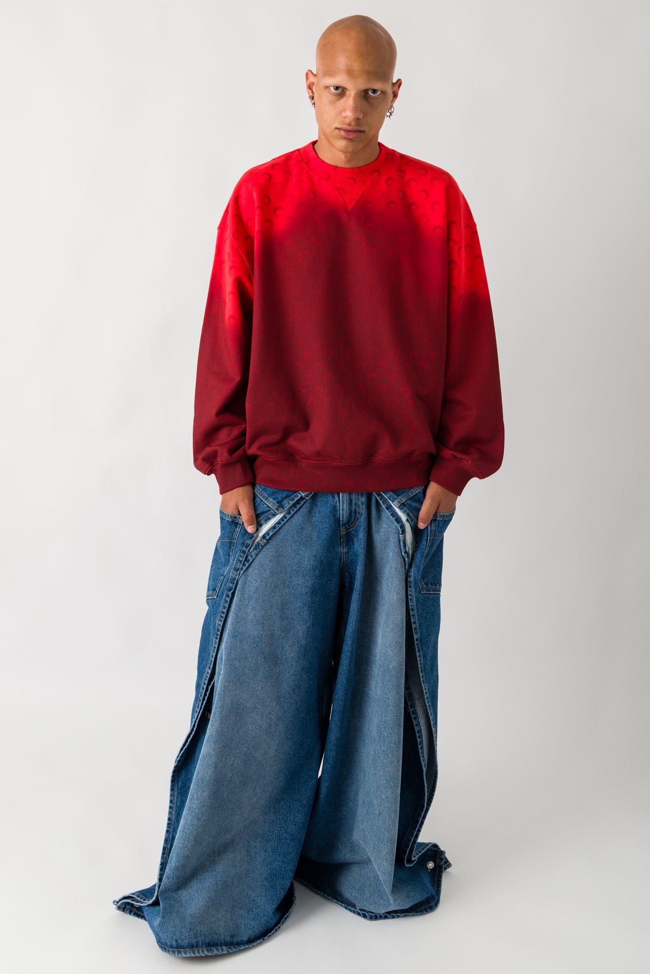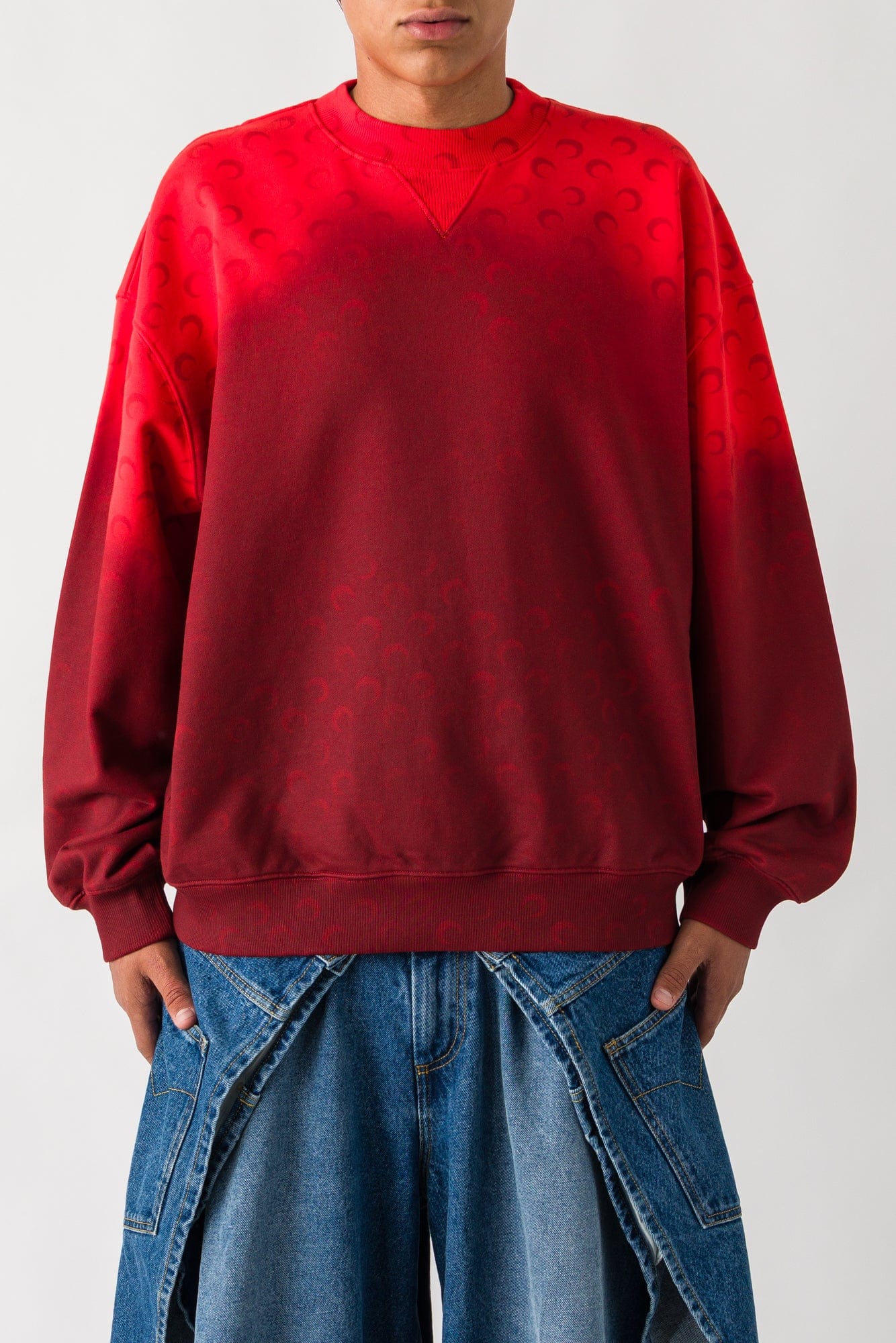 Marine Serre presents the Moon Faded Fleece Oversized Sweatshirt in Red for their Fall/Winter 2025 collection. This regenerative French terry sweatshirt features fading and printed logo pattern throughout with rib-knit crewneck, hem, and cuffs, complete with dropped shoulders and logo patch at the back collar.