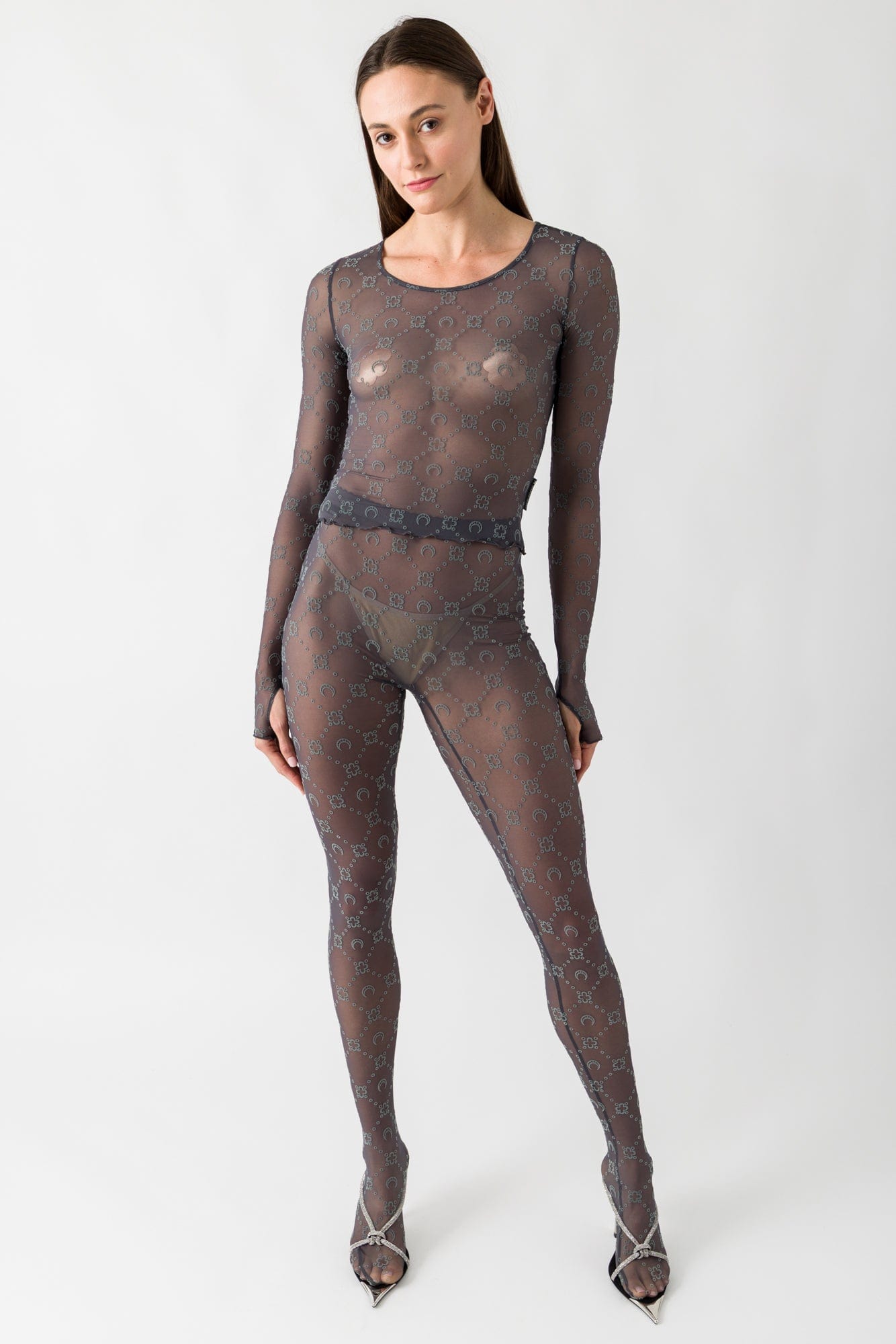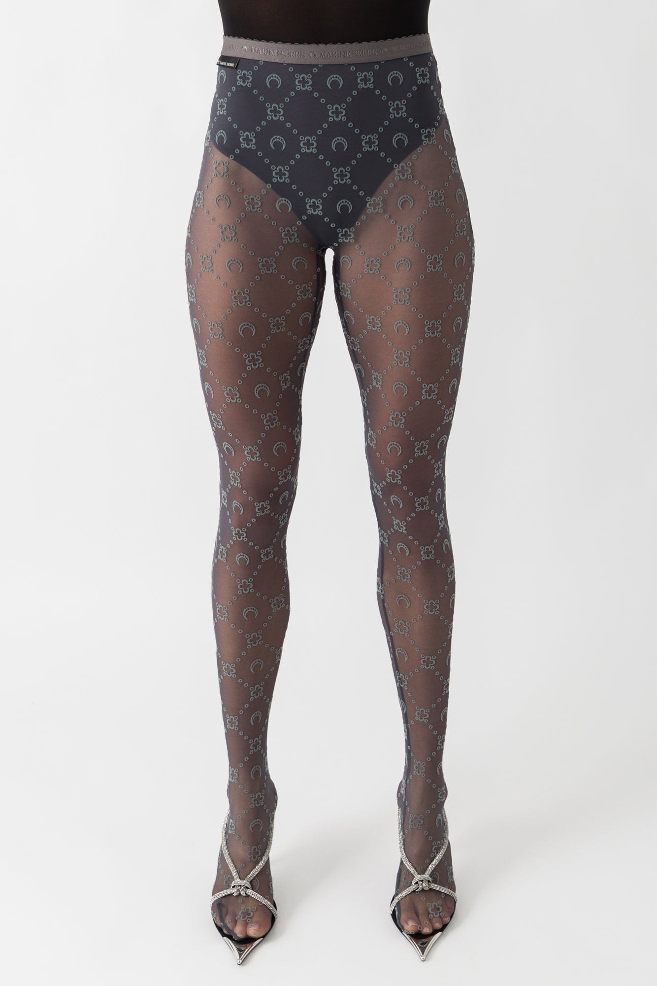 The Marine Serre Spring/Summer 2025 collection presents the Recycled Mesh Flock Tights in gray recycled polyamide. The sheer design features an all-over flocked logo pattern, scalloped logo-woven elastic waistband, and signature flag detail.