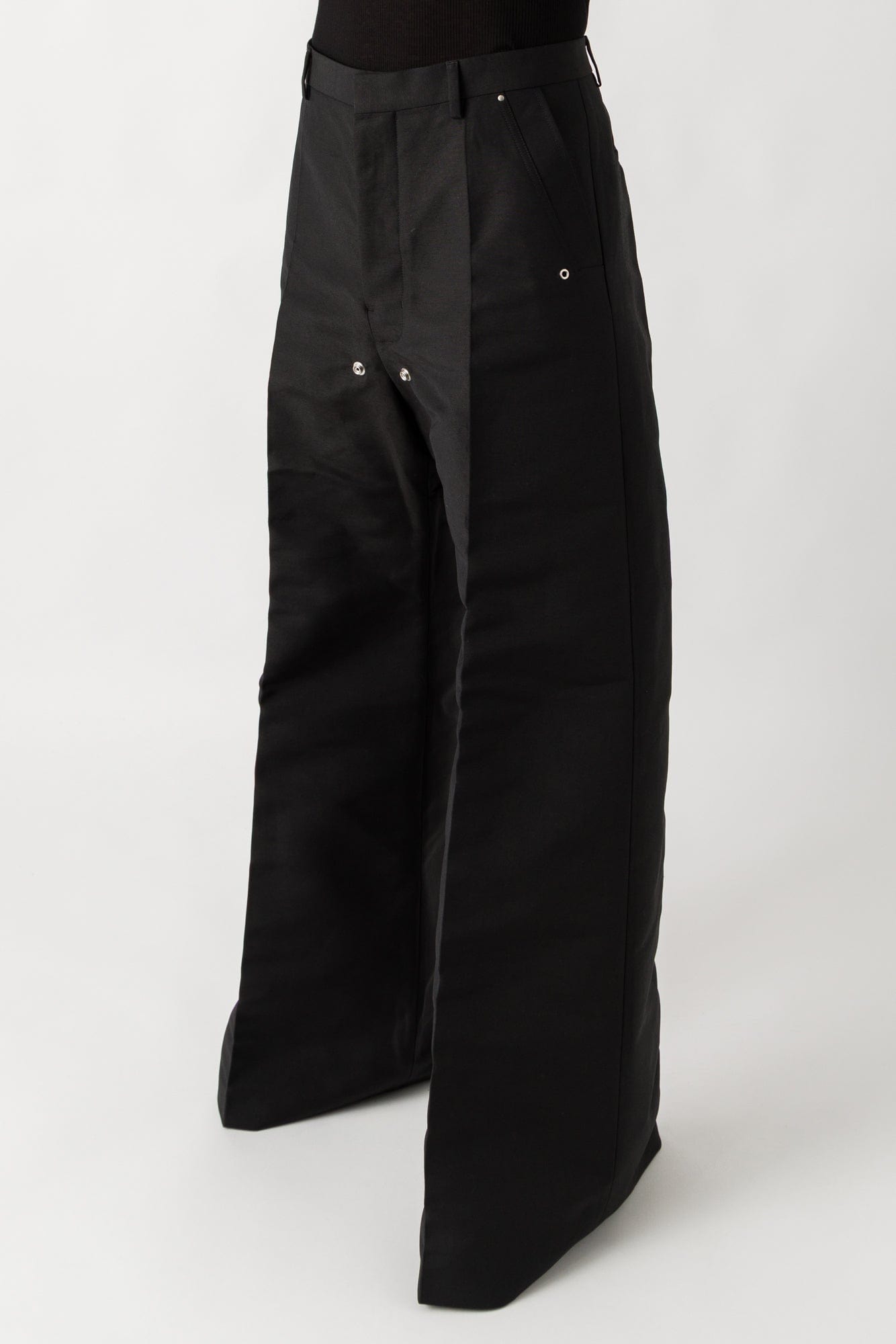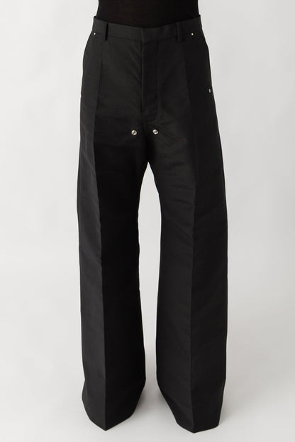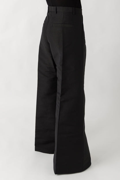 These Rick Owens Tailored Belas from Spring/Summer 2025 are full-length trousers with a low crotch and wide leg cut in black heavyweight faille. They feature a concealed button fly, side and rear welt pockets with rivet details, and are made from GOTS certified organic cotton, certified viscose, and recycled polyester.