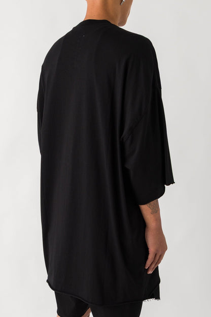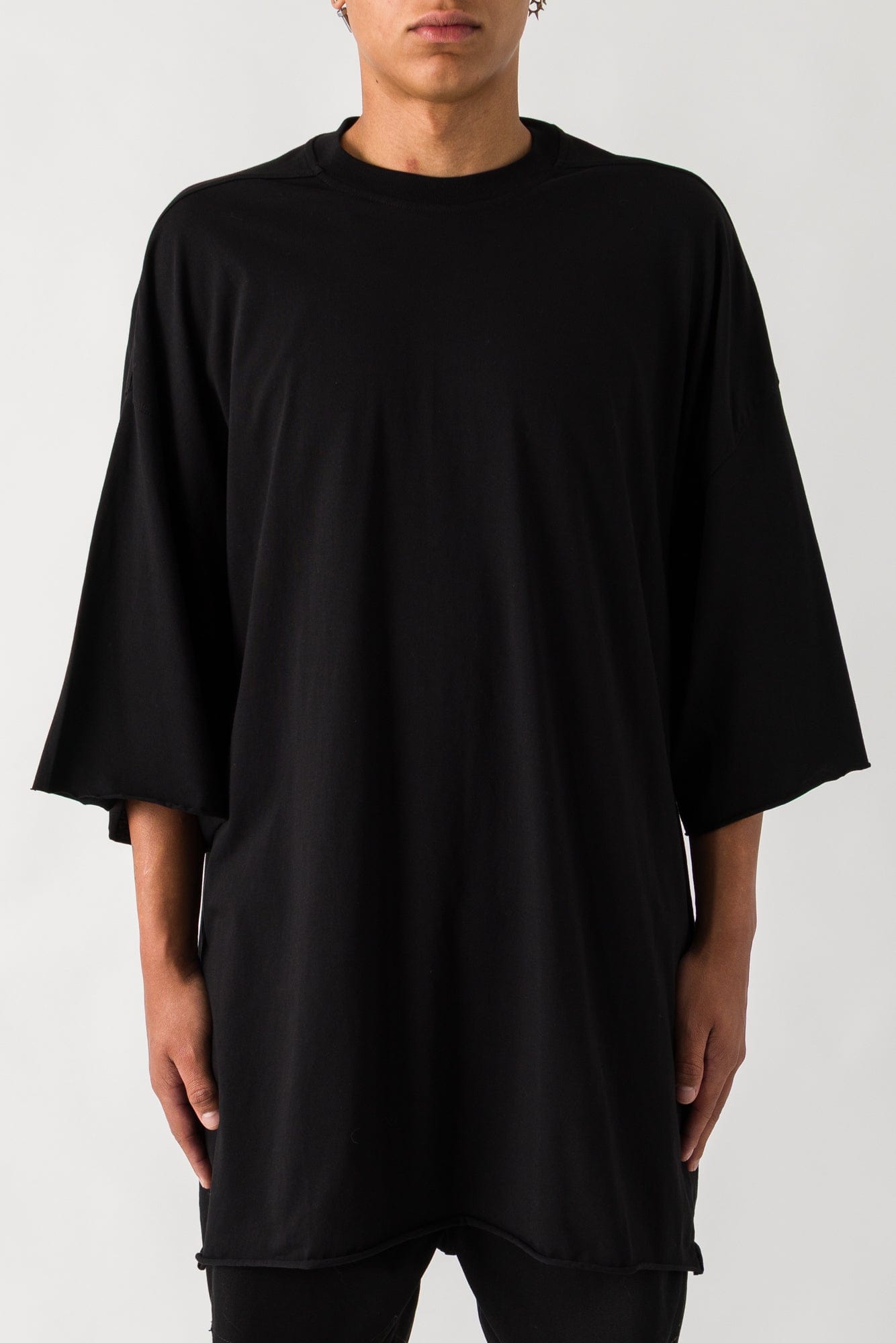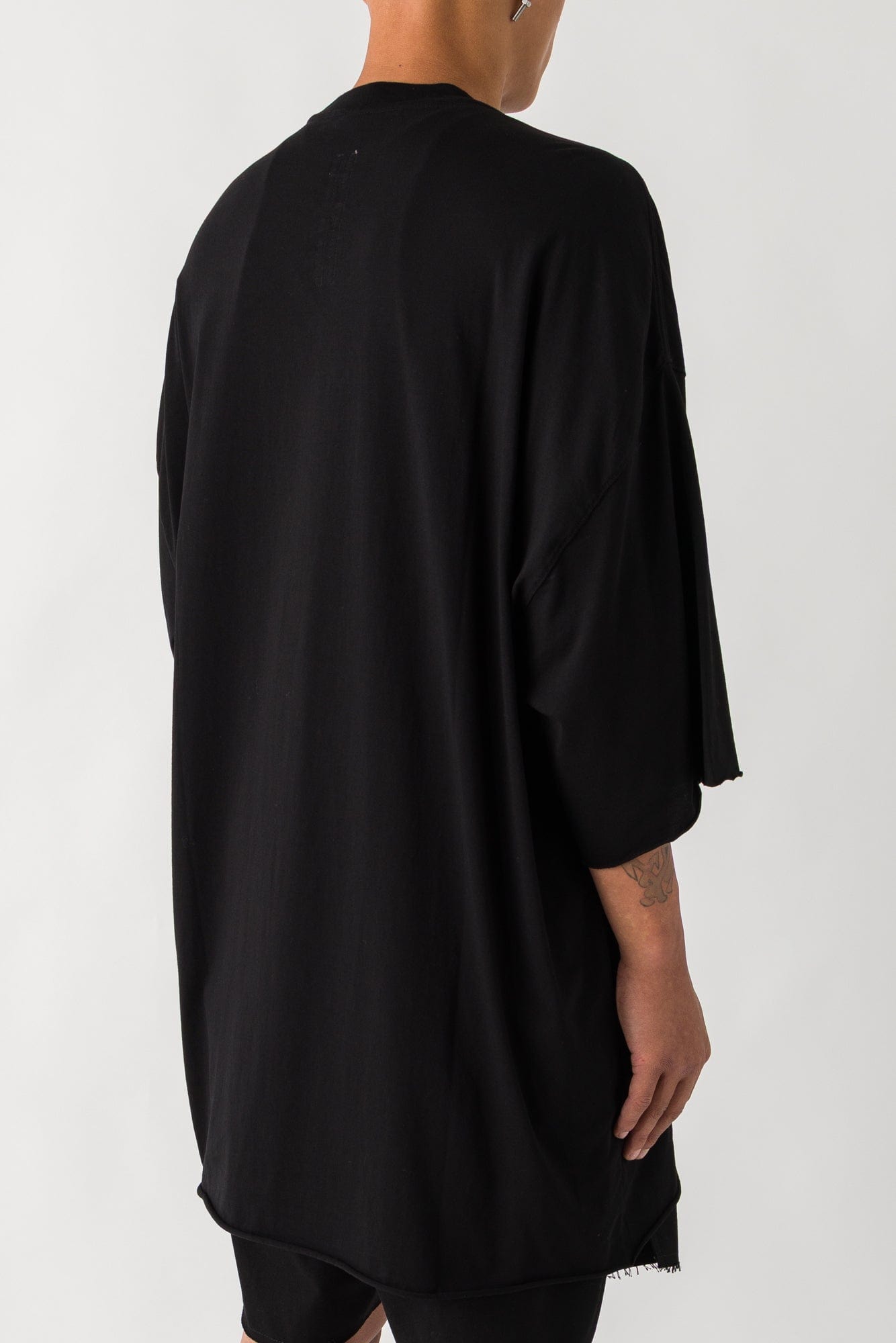The Rick Owens Spring/Summer 2025 collection presents the Tommy T-shirt in a black midweight jersey material. This design features a crew neck with a straight hem and raw-cut finish.