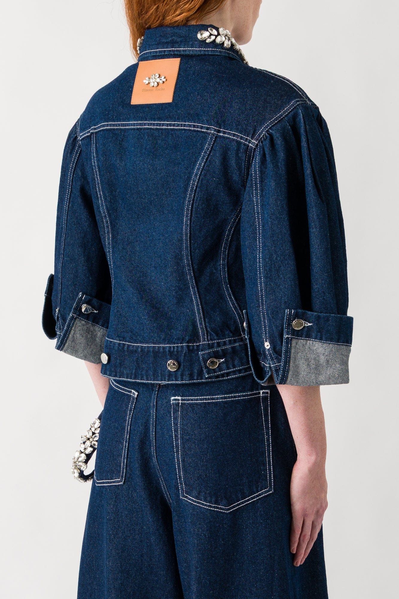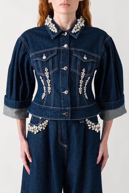 Simone Rocha presents the Sculpted Cropped Denim Jacket with Embroidery for their Spring/Summer 2025 collection. This non-stretch denim jacket features crystal-cut floral accents throughout with spread collar and button closure, complete with flap pockets, cropped hem, pleated shoulders, and logo-engraved silver-tone hardware with contrast white stitching.