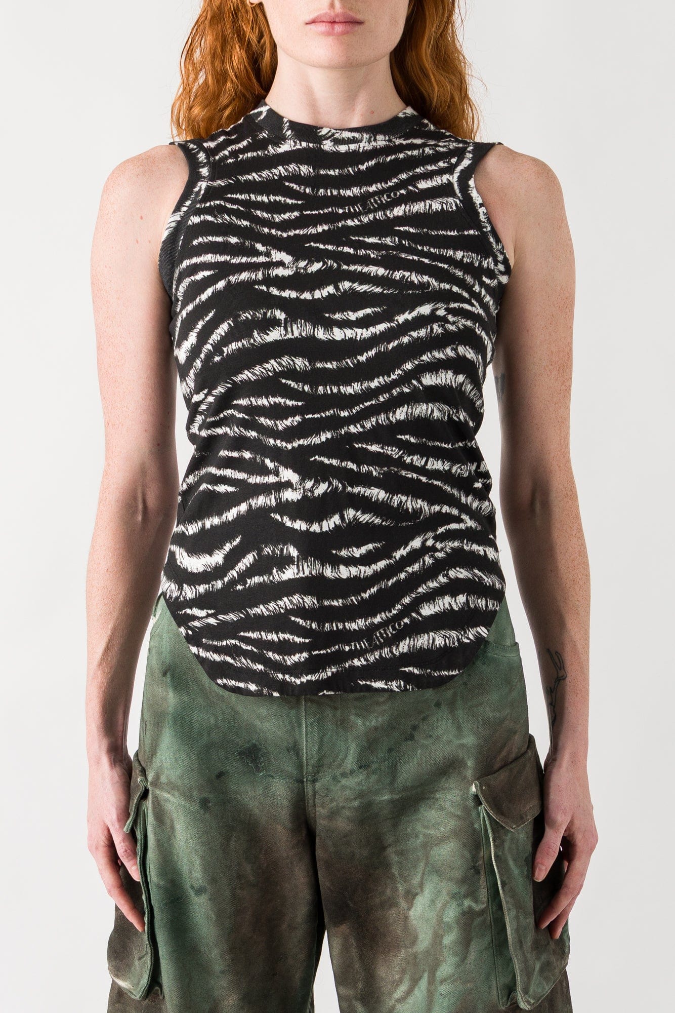 The Attico presents the Tank Top in Black and White Zebra Print for their Spring/Summer 2025 collection. This light jersey piece features a round neck with a sleeveless design and shaped bottom, complete with an embroidered logo and straight hem.