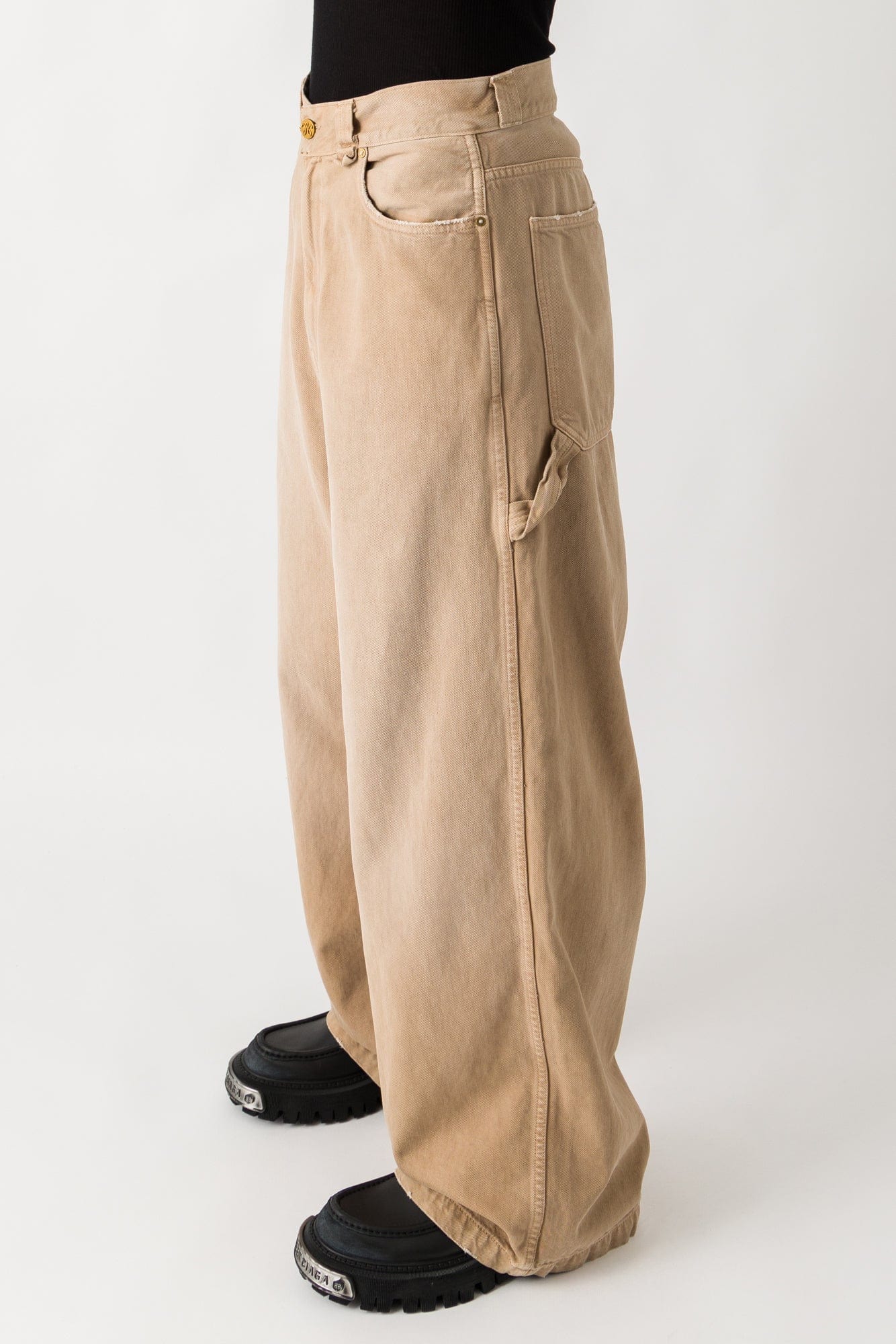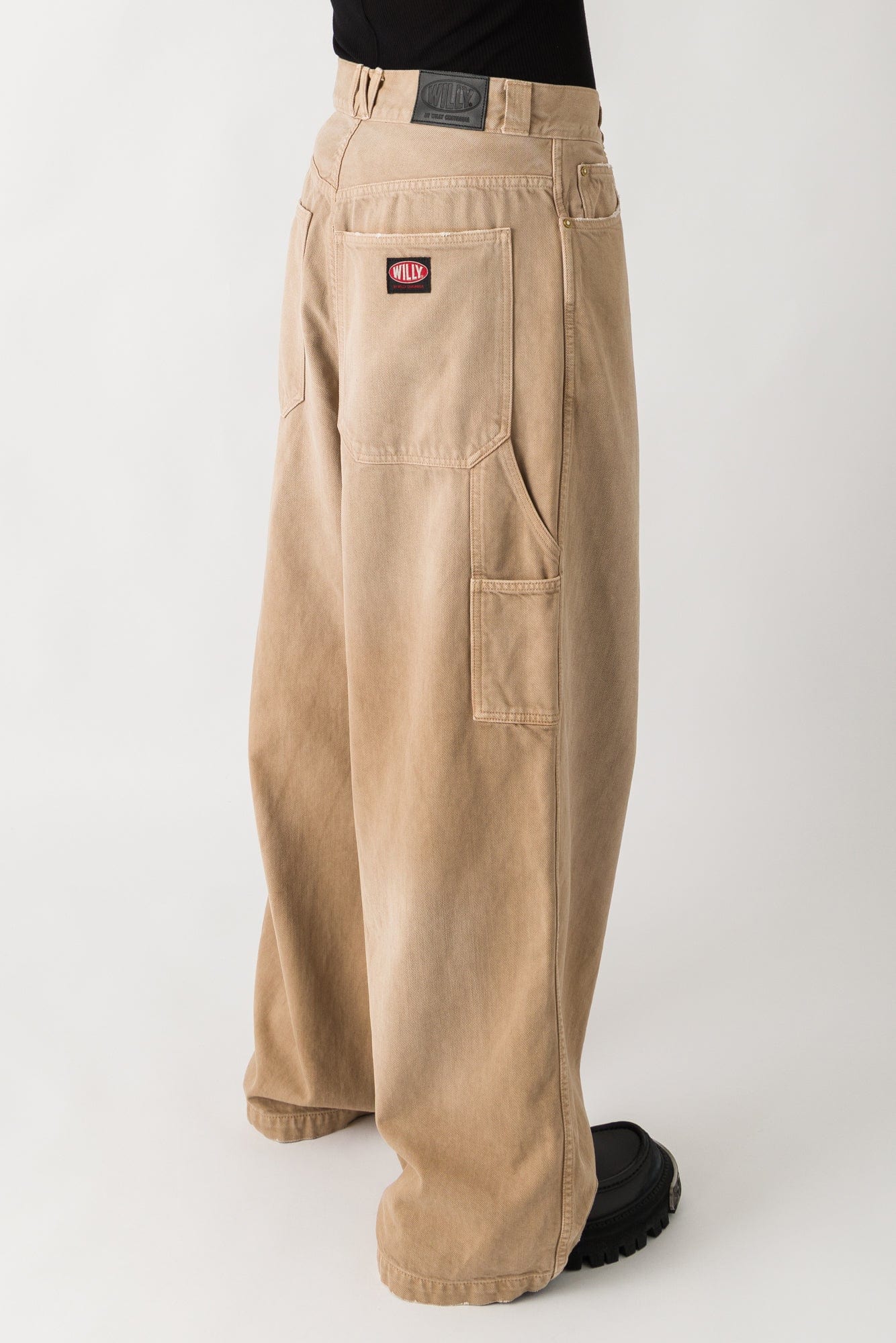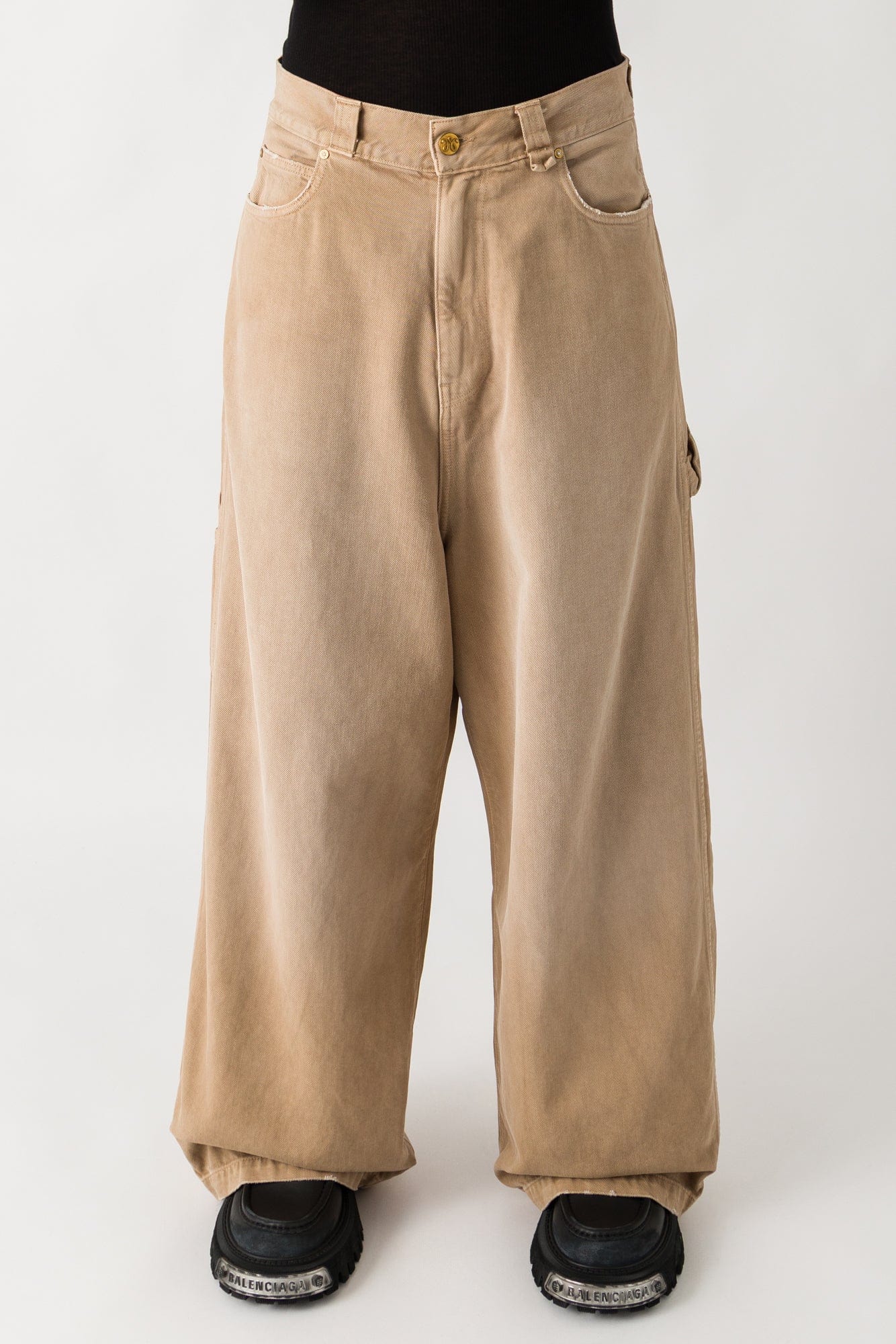 The Willy Chavarria Fall/Winter 2025 collection presents the XL Carpenter Jeans in beige denim. The oversized design features a rigid wide-leg silhouette with classic five-pocket styling, zip fly, and button closure. The construction includes fading throughout the thighs. The jeans reimagine a classic design through exaggerated proportions.